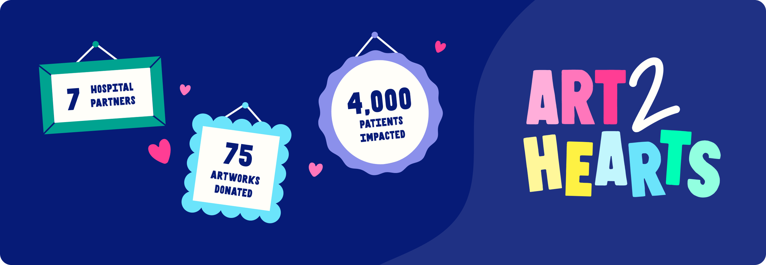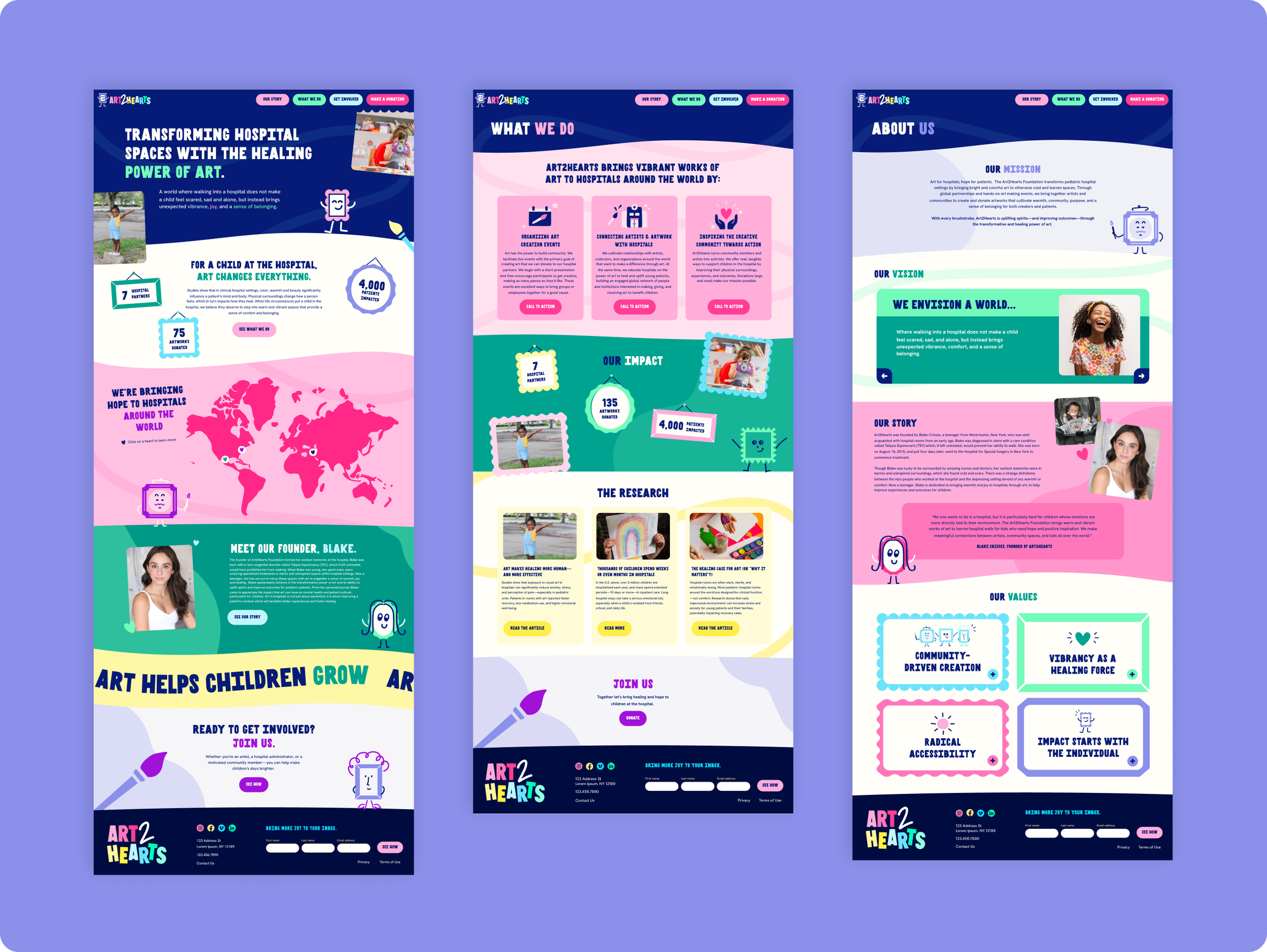 Art2Hearts is a new nonprofit organization that seeks to bring joy to children in hospitals. This project began from the ground up and included branding, messaging, and website design. I collaborated with both the Art2Hearts founder – a 14 year old with a history of hospital stays – and the Great Believer team to create an identity for the org. The visual system centers around art, color and lightheartedness, reflecting the warmth and optimism at the heart of Art2Hearts. The final website clearly communicates the mission and is designed to be engaging for all new visitors.